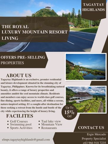 The Newest pre-selling development project in Tagaytay Highlands An Eco - focused community designed in a holistic manner that enable a sustainable lifestyle!